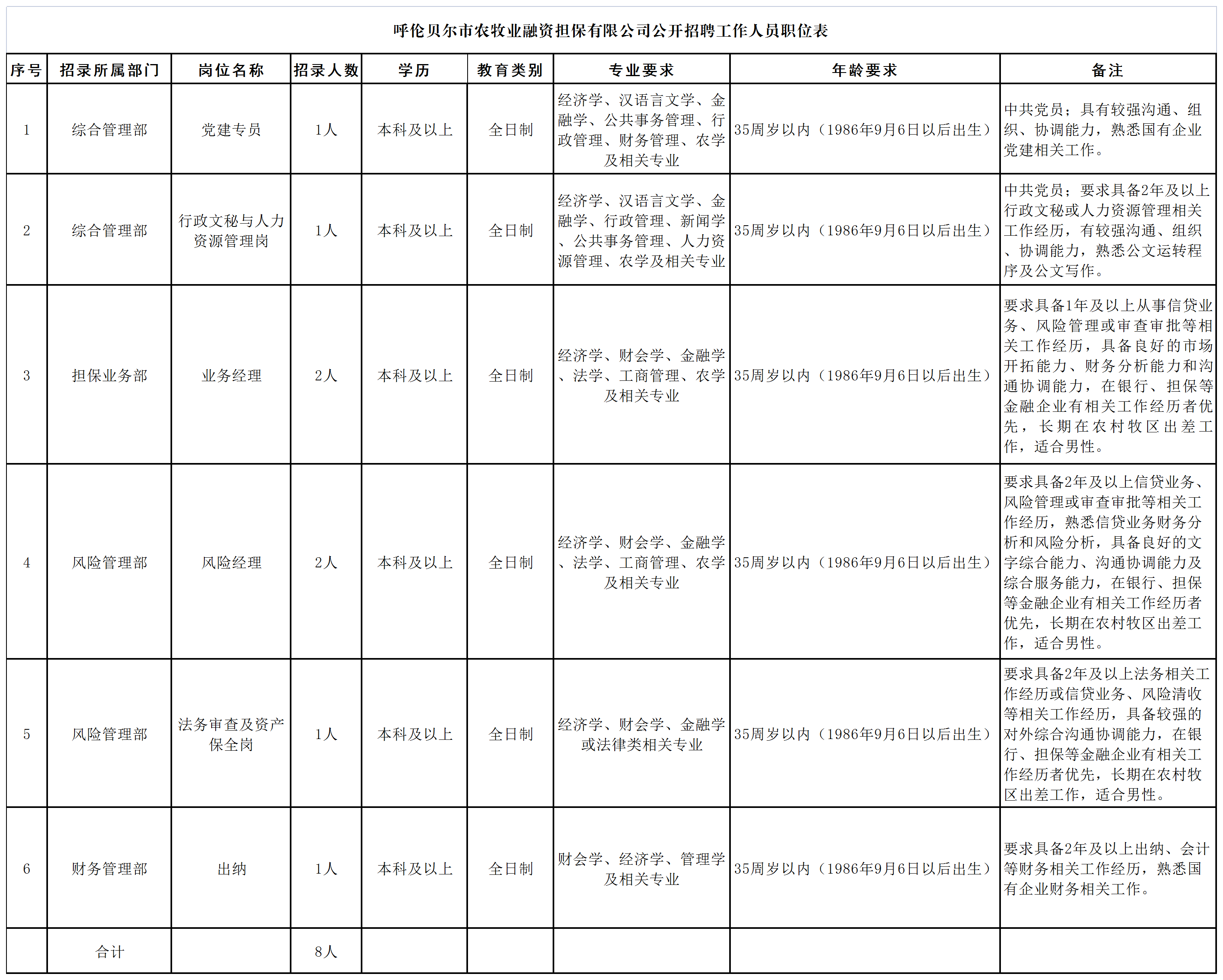 呼倫貝爾市農(nóng)牧業(yè)融資擔保有限公司公開招聘工作人員簡章